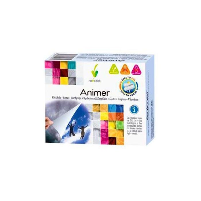 NOVADIET Animer 60 Cap. Suplemento Efecto Día y Noche Vegano Vitaminas B1, B6, B12 Rhodiola GABA Probióticos