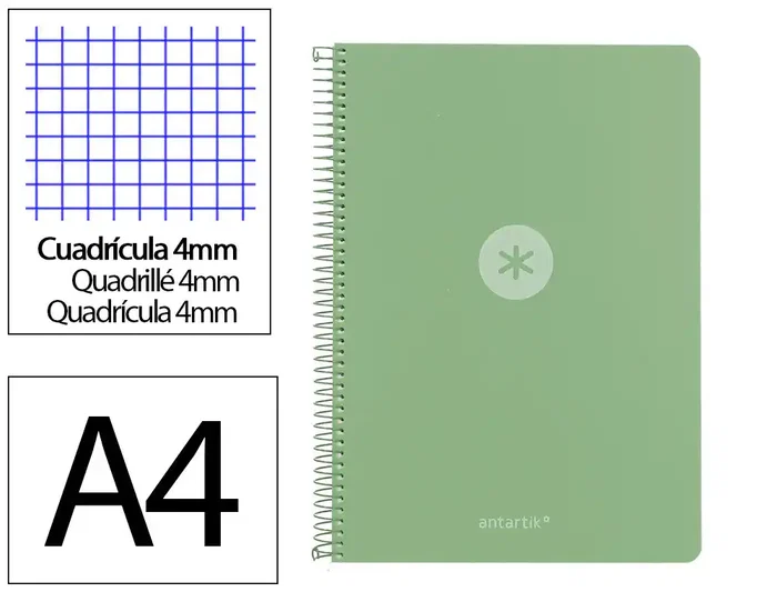 Cuaderno espiral antartik a4 tapa foam 80h 90gr cuadro 4mm con margen color verde matcha