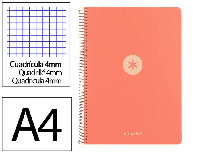 Cuaderno espiral antartik a4 tapa foam 80h 90gr cuadro 4mm con margen color coral