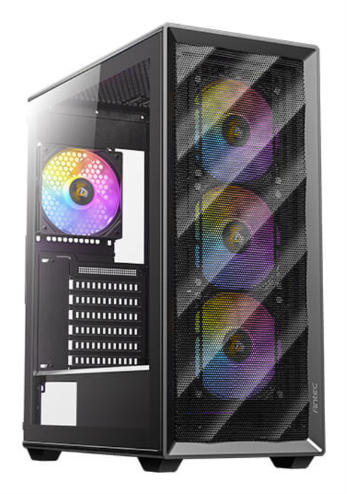 Antec AX85 ARGB. Factor de forma: Midi Tower, Tipo: PC, Color del producto: Negro. Ventiladores frontales instalados: 3x 120 mm, Diámetro de ventiladores frontales soportados: 120,140 mm, Ventiladores traseros instalados: 1x 120 mm. Tamaños de disco duro soportados: 2.5,3.5". Ancho: 205 mm, Profundidad: 393 mm, Altura: 485 mm. Ancho del paquete: 270 mm, Profundidad del paquete: 445 mm, Altura del paquete: 552 mm