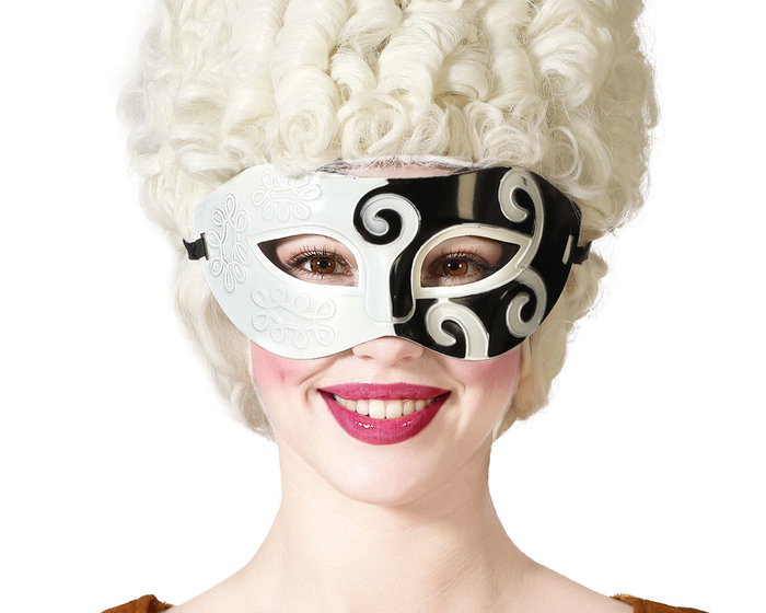 Inspira elegancia y contraste con este antifaz blanco y negro decorado con relieves. ideal para disfraces de época, personajes enmascarados o eventos venecianos. su diseño equilibrado es perfecto para destacar en una fiesta elegante o espectáculo teatral.