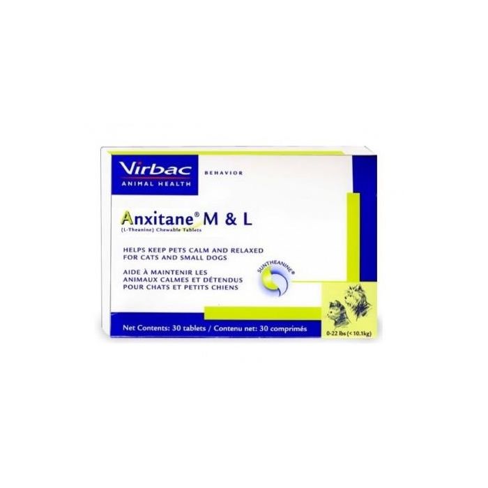 - COMPOSICIÓN: Gamma-ciclodextrina, té verde seco concentrado* (min 22,8 %), maltodextrina, subproductos del pescado, minerales, levaduras, estearato de magnesio, azúcares. *Fuente rica en L-Teanina. PROPIEDADES: Disminuye las reacciones frente al estrés y al miedo, asociados o no a cambios ambientales (miedo a los seres humanos, a otros animales, a salir de casa, cambios en la casa, pirotecnia. Permite aumentar la concentración en el aprendizaje . Efectos relajantes sin somnolencia. INSTRUCCIONES: perros <10 kg y gatos: 1/2 comp. de Anxitane S por la mañana y por la tarde. Perros 10-25 kg, 1/2 comp. de Anxitane M/L por la mañana y por la tarde. Perros +25 kg:1 comp. Anxitane M/L por la mañana y por la tarde. Para un resultado óptimo, administrar dos veces al día mínimo 2 meses, repitiendo si es necesario. No exceder dosis diaria. Comprimidos altamante palatables, se pueden adaministrar fácilmente con la mano o en el recipiente de la comida como una golosina.