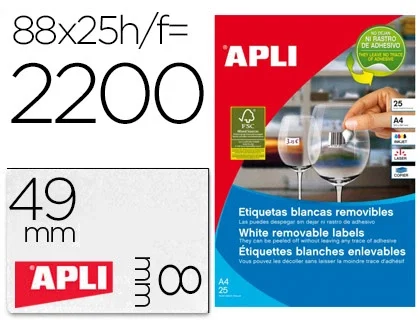 Etiquetas adhesivas compatibles con impresoras ink-jet, láser y fotocopiadoras. Cada caja, según tamaño, incluye 20, 25 o 100 hojas en las que se presentan las etiquetas.