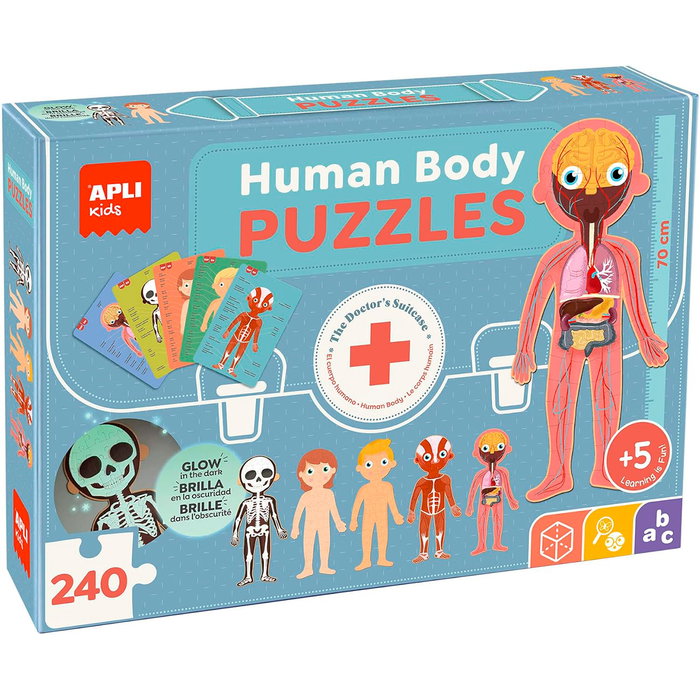 Puzle de temática Cuerpo Humano para descubrir las diferentes partes, el esqueleto, los órganos y los músculos. Incluye 5 puzles en forma del cuerpo humano, 15 fichas con información detallada en 12 idiomas distintos. Brilla en la oscuridad.
