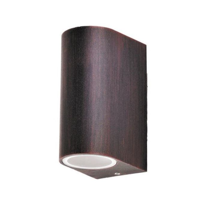 Aplique de exterior de estilo moderno con 2 casquillos en diseño con iluminación dirigida hacia arriba y hacia abajo. Luminaria de color marrón antiguo, de 14,5 cm de alto y 6,5 cm de ancho, fabricada en metal y tulipas de cristal con protección IP44 contra salpicaduras de agua y polvo. La luminaria también se puede utilizar con 2 fuentes de luz de bajo consumo de hasta 35 W, con casquillos GU10.