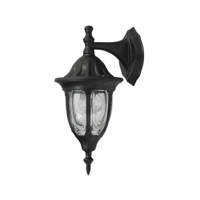 Aplique de exterior de estilo clásico con 1 casquillo. La luminaria de metal de color negro, de 37 cm de altura y 20,5 cm de largo, tiene una pantalla de cristal y un grado de protección IP43. La luminaria se puede utilizar con una fuente de luz de hasta 60W, con casquillo E27.