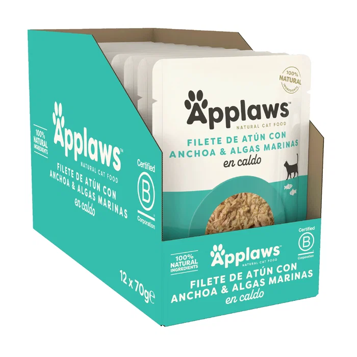 Comida húmeda Applaws para gatos en sobres. Elaborada con ingredientes 100% naturales y fuentes de proteína de calidad apta para consumo humano. Receta de atún y anchoas en caldo, rica en taurina natural para apoyar la salud cardiaca y ocular de tu gato. Para una dieta completa y equilibrada, se recomienda complementarla con alimento seco Applaws.