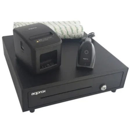 Approx APPPOSPACK4180LAN-2D Pack TPV con Cajón Portamonedas, Impresora Térmica 80mm, Lector Códigos 2D y 8 Rollos Papel sin BPA
