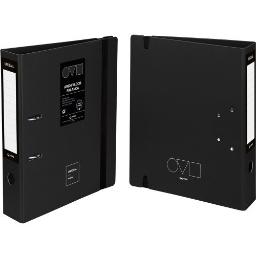 Archivador A4 65 mm Unequal Minimal Color negro. Este archivador tiene sus cubiertas realizadas en polyfoam, un material resistente y ultraligero. Permite una apertura 360º y cuenta con un tarjetero en lomo con cartulina impresa pegada, mecanismo de palanca niquelado, ollao y rados. Tiene también un práctico cierre con goma plana, que impedirá que se pierdan todos sus documentos.