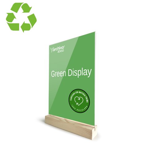 Expositor de sobremesa Green Display Archivo 2000 A7 con base de madera. Fabricado en metacrilato 100% reciclado/reciclable ultra transparente y resistente. Base con acabado lijado y canal pasante, ranura anticaída adaptada a cada formato para una mayor seguridad del documento. Medidas madera: 20 x 75 x 30 mm. Medidas exteriores: 125 x 75 x 30 mm.