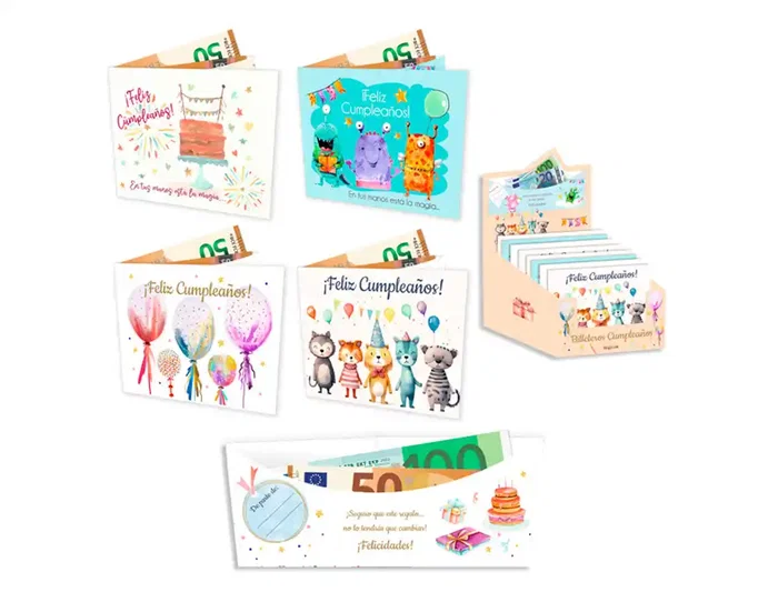 Billetero de felicitación cumpleaños con diseños surtidos. Medidas: 11x8,5cm.
