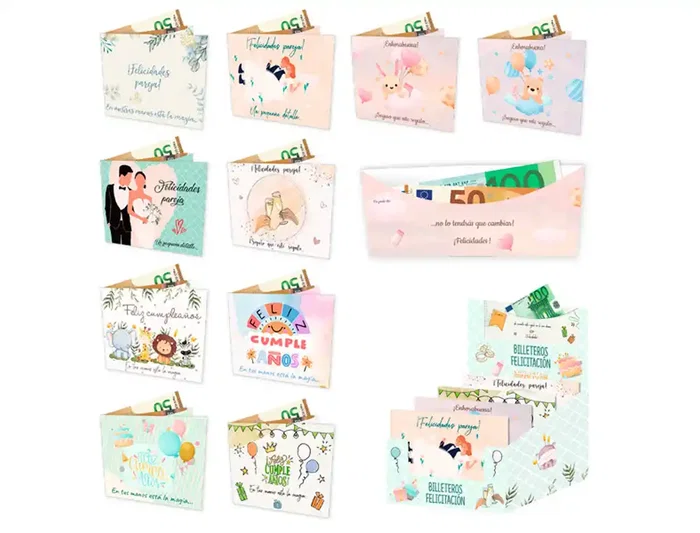Billetero de felicitación surtido bebe, bodas y cumpleaños diseños surtidos. Medidas: 11x8,5 cm.