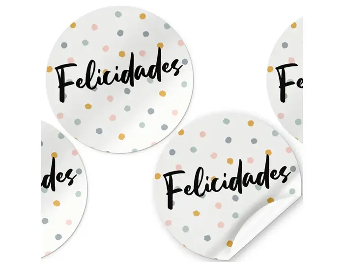 Rollo de 250 etiquetas redondas felicidades con 4 cm. diametro. Perfecto para decorar el regalo que quieres realizar.