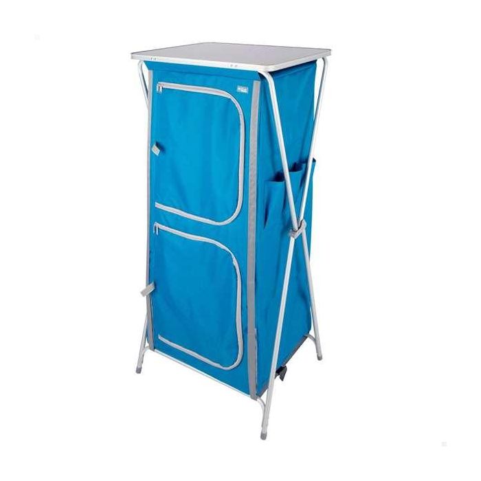 Armario desmontable ideal para tus aventuras al aire libre. Su estructura está fabricada de aluminio color gris y su tejido es de poliéster color azul, un material resistente y duradero, capaz de soportar la exposición a la intemperie sin desgastarse fácilmente. Cuenta con cuatro amplios compartimentos para organizar ropa, utensilios de cocina o cualquier otra pertenencia que vayas a utilizar en los días de acampada. ¡Tú eliges! Incluye tablero superior que sirve como mesa o como base para cocinar, así como bolsillos exteriores laterales para tener tus pertenencias a mano en todo momento. El armario incorpora dos paneles de rejilla en la parte trasera para ventilar y evitar la acumulación de humedad en su interior y dos puertas de tela con cierre de cremallera que pueden mantenerse abiertas gracias a las dos tiras de velcros laterales. Es un mueble resistente, con protecciones antideslizantes en las patas para mayor estabilidad. Es plegable, fácil de montar y desmontar y se puede guardar sin ocupar mucho espacio gracias a su bolsa de transporte y almacenamiento.