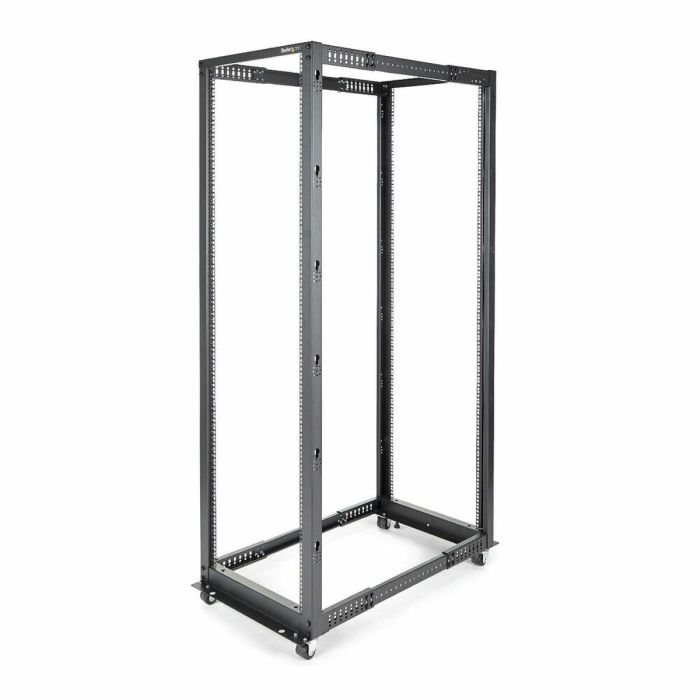 El armario rack mural de la marca Startech, modelo 4000498029138, es una solución robusta y versátil diseñada para la organización y protección de equipos informáticos, servidores y dispositivos de red en entornos profesionales. Este rack independiente, construido en acero negro y gris con detalles en plástico, ofrece una estructura resistente capaz de soportar una carga máxima estática de hasta 600 kg, garantizando la seguridad y estabilidad necesarias para instalaciones técnicas exigentes. Su diseño de cuatro postes abiertos permite un montaje ajustable en profundidad desde 22 hasta 40 pulgadas (56,0 a 101,7 cm), lo que facilita la adaptación a distintos equipos y configuraciones, mientras que las marcas impresas indican claramente la posición de las unidades (U), con una capacidad total de 42U, una característica clave para maximizar el aprovechamiento del espacio vertical. Además, incluye opciones para una gestión eficiente del cableado gracias a sus ganchos organizadores, que contribuyen a mantener el orden y mejorar la disipación del calor. El armario cuenta con ruedas y patas niveladoras opcionales, que proporcionan movilidad y estabilización en diferentes superficies, mientras que los orificios taladrados en la base permiten anclarlo firmemente al suelo cuando se requiera mayor sujeción. Cumple con las normas internacionales EIA/ECA-310, IEC 60297 y DIN 41494, lo que asegura la compatibilidad con la mayoría de los estándares y equipos del sector tecnológico. Con un peso aproximado de 38,5 kg y un diseño orientado a la funcionalidad y fácil uso, este rack es ideal para centros de datos, oficinas técnicas o instalaciones que requieran un bastidor resistente, ajustable y que facilite una correcta gestión del hardware y el cableado. En resumen, el rack mural Startech ofrece una solución duradera, flexible y segura para la organización profesional de equipos informáticos en entornos diversos.