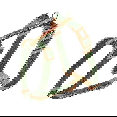 Arnes de nylon con cinco puntos de regulación para una óptima adaptación. Fabricado con doble nylon que combinan dos colores. Dos cierres en click y arandela metálica para mayor seguridad y resistencia. Disponible en 8 combinaciones de color y 4 medidas.