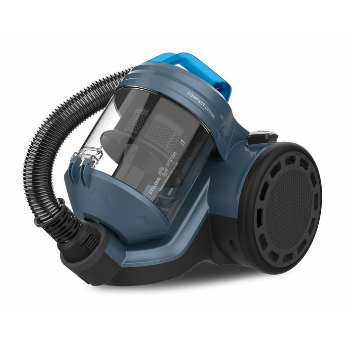 El aspirador HOMELAND CYC AN de la marca Taurus es un equipo diseñado para ofrecer una limpieza eficaz y cómoda en diferentes tipos de superficies, adaptándose tanto a suelos duros como a alfombras. Cuenta con una potencia de 800 W que garantiza un rendimiento suficiente para la mayoría de trabajos domésticos sin un consumo energético excesivo. Su sistema ciclónico sin bolsa facilita el mantenimiento y evita la pérdida de succión, aportando eficiencia constante durante su uso. Además, dispone de una capacidad para polvo de 2 litros, un volumen adecuado que reduce la frecuencia de vaciado y permite realizar limpiezas prolongadas sin interrupciones. El diseño incluye tubería telescópica que favorece el manejo y el almacenamiento del aparato, adaptándose a la altura del usuario para mayor comodidad. En cuanto al aspecto exterior, presenta una combinación de colores predominantes en negro y azul que refuerzan un acabado moderno y atractivo. Su nivel de ruido alcanza los 78 decibelios, un valor habitual que merece consideración en hogares que valoran la tranquilidad durante las tareas de limpieza. Este aspirador de tipo trineo destaca por la practicidad de su estructura y la calidad típica de Taurus, ofreciendo una solución equilibrada para quienes buscan funcionalidad y facilidad de uso en un electrodoméstico pensado para el cuidado diario del hogar.