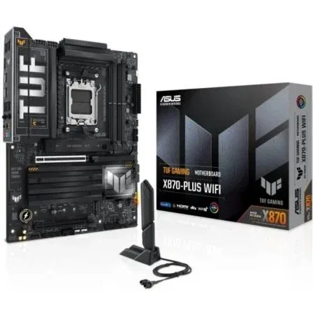 ASUS TUF GAMING X870-PLUS WIFI toma todos los elementos esenciales de los últimos procesadores AMD Ryzen™ y los combina con funciones listas para jugar y una durabilidad probada. Diseñada con componentes de grado militar, una solución de alimentación mejorada y un completo sistema de refrigeración, esta placa base supera las expectativas con un rendimiento sólido como una roca y estable para juegos maratonianos. Las placas base TUF GAMING también se someten a rigurosas pruebas de resistencia para garantizar que pueden soportar condiciones en las que otras podrían fallar. Esta plataforma ofrece la potencia y la conectividad que exigen las aplicaciones informáticas avanzadas de IA.