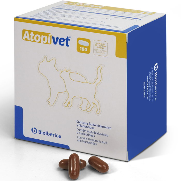 ATOPIVET® Cápsulas de Bioiberica está formulado para apoyar la reparación cutánea y la proliferación de fibroblastos gracias a Nucleoforce®. Dermial®Vet (ácido hialurónico) contribuye a aumentar significativamente la proliferación de los queratinocitos y la migración de los fibroblastos dérmicos, mejorando la hidratación de la piel.