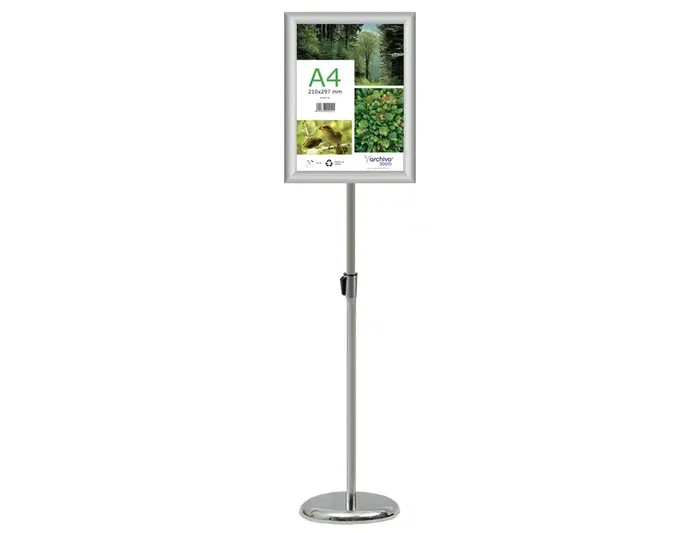 Atril expositor de pie con marco de aluminio en DIN A4 y sistema de apertura fácil SnapFrame que permite cambiar fácilmente el contenido. Panel frontal transparente y anti reflectante para ver la información con total nitidez. Versátil por su capacidad para cambiar fácilmente su orientación horizontal y vertical. Diseño elegante de pie con sólida base, muy resistente para una total estabilidad. Color plata. Medidas exteriores:1225 x 250 x 250 mm.