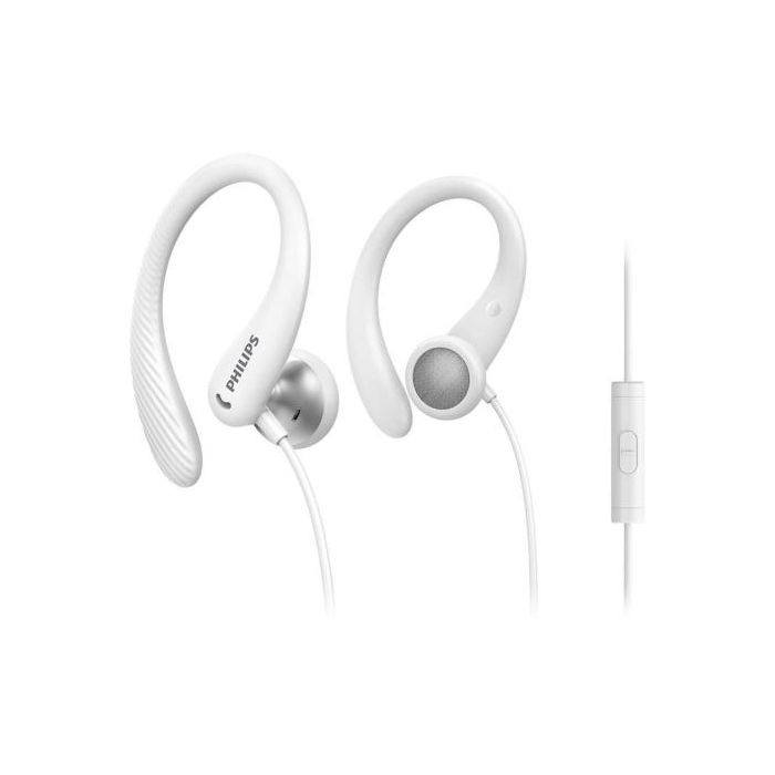 Auriculares deportivos Philips con micrófono integrado, en color blanco. Perfectos para actividades físicas, ofrecen sonido de calidad y manos libres para tus llamadas. Fabricados por Philips, garantizando durabilidad y un diseño ergonómico para un ajuste cómodo y seguro durante el movimiento.