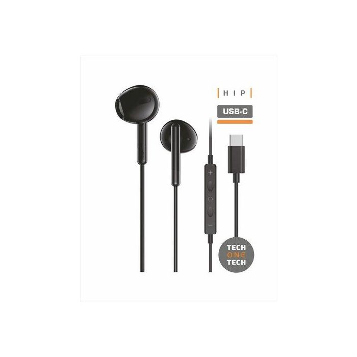 Tech One Tech Hop Auriculares USB-C Negros Intraurales con Micrófono y Controles de Volumen, Compatibles con Apple, Android y Windows