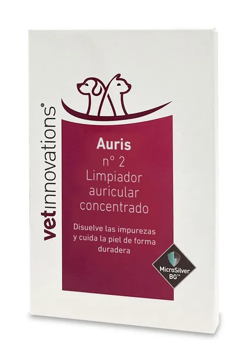 Producto veterinario Auris N2 Limpiador Auricular Concentrado de la marca Vetinnovation. Este limpiador auricular concentrado está presentado en un práctico formato de 5 viales de 1 mL cada uno para una higiene profunda y eficaz en mascotas.