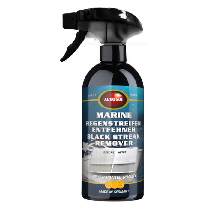 Bottle 500 Ml 12 Uds Box 780 Uds Pallet AUTOSOL® MARINE RAIN STRIPS REMOVER Potente limpiador para eliminar las manchas de lluvia en yates, barcos y embarcaciones. También es muy adecuado para eliminar aceite, grasa, diésel y suciedad ambiental de gelcoat, plástico, metal, vidrio y superficies pintadas.