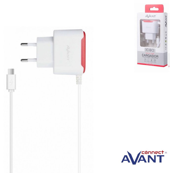 Cargador de corriente blanco de la marca AVANT CONNECT. Compatible con dispositivos que utilizan conexión Micro USB. Proporciona una salida de carga de 1A, ideal para cargar smartphones, tablets y otros accesorios de forma rápida y segura.