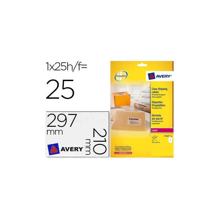 Avery Etiquetas Adhesivas Transparentes 210x297 mm Poliéster Resistente Caja 25 Unidades