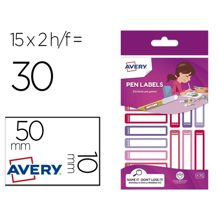 Avery Etiqueta para bolígrafos y lápices rosa y violeta 50x10 mm blister de 30 unidades adhesivas permanentes