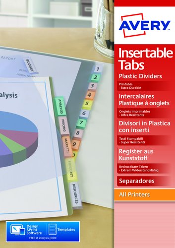 Separadores de colores transparentes con perforado universal, fabricados en polipropileno de 180µ, para usar con impresoras inkjet y láser. Son ideales para organizar tu trabajo tanto en casa como en la oficina.