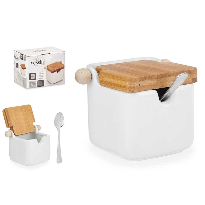 Vessia Azucarero Cerámica Blanco Tapa Bambú Acero Inoxidable 10 cm x 7.5 cm x 8 cm (Set de 6)