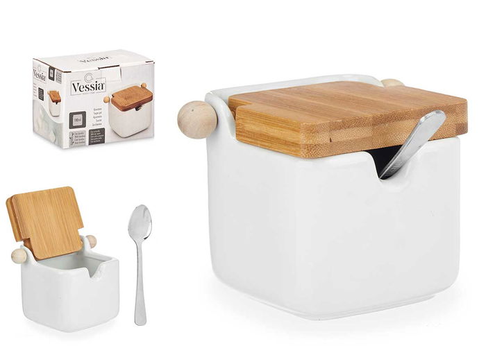 Vessia Azucarero de Cerámica Blanco con Tapa de Bambú, Capacidad 190 ml, Dimensiones 10x8x7.5 cm, Incluye Cucharilla (Set de 6)