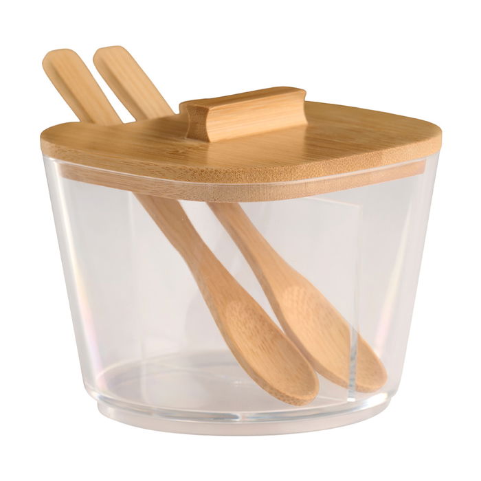 - Azucarero de plástico transparente con tapa y dos cucharas de bambú.