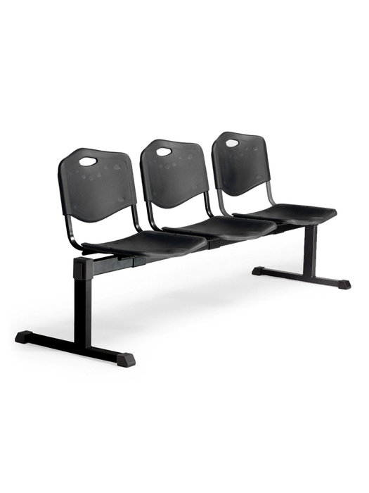 Bancada de espera de tres plazas y estructura de hierro en color negro Bancada de espera con topes regulables. Diseño robusto que se adapta a cualquier sala de espera de interior. Los asientos y respaldos son de PVC negro, lo que permite una fácil limpieza Detalles técnicos Respaldo ergonómico para una mejor adaptación a la espalda. Respaldo de PVC Asiento ergonómico para una mayor comodidad del usuario. Asiento de PVC Asiento y respaldo en PVC color negro Travesaño de hierro Estructura en color negro Sistema de enganche en forma de U al chapón de hierro Estructura de las patas de tubo rectangular Otros detalles Favorece una buena postura integral para evitar posibles problemas de espalda Ergonómica 24 meses de garantía Instrucciones de montaje incluidas Fácil montaje