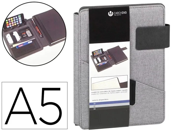 Carpeta para documentos. Incluye soporte tipo atril para Smartphone o tablet. Múltiples bolsillos elásticos para accesorios de diferentes dimensiones. Incluye un cuaderno de 80 g/m². Cierre de trabilla con imán oculto. Color gris. Formato DIN A5.