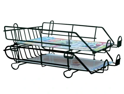 Bandeja metálica, pintada, apilable. Con portatarjeta. Color negro. Medidas: 280 x 85 x 370 mm.