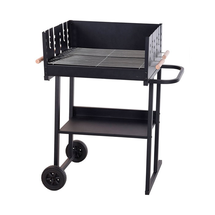 Barbacoa rectangular de hierro dimensiones: 60x46x93cm (ancho/fondo/alto) altura de zona de cocción 75 - 87cm color negro. gracias a las ruedas puede moverla fácilmente. con estante inferior donde puedes guardar los alimentos y utensilios necesarios para tenerlos a mano.