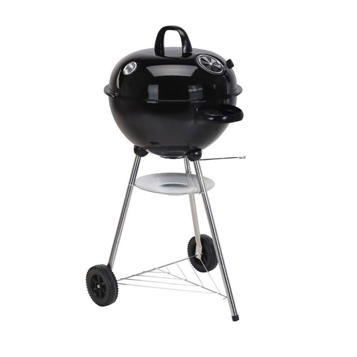 Barbacoa esférica acabado en esmalte negro, ø47 x 90 cm, espesor 0.7 mm, altura de cocción 75 cm, parrilla de cocción cromada ø435 mm, espesor del alambre 3.0/4.0 mm, patas tubo acero inoxidable ø22 mm, termómetro celsius en la tapa, abertura de ventilación ajustable, con 2 ruedas para fácil movilidad
