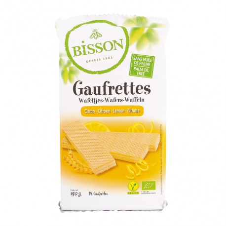 Sabrosas galletas gaufrettes a base de harina de trigo, con zumo de limón y aceite esencial de limón. Veganas y con certificado kosher.