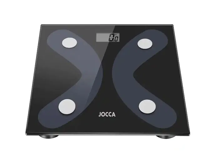 La báscula con bluetooth 4.0 de Jocca está hecha de vidrio templado con dos grandes puntos de contacto para máxima precisión en la determinación del porcentaje de grasa corporal, agua corporal, masa muscular, hueso, IMC, calorías, grasa visceral y peso que podrás ir controlando a través de una aplicación móvil o App.