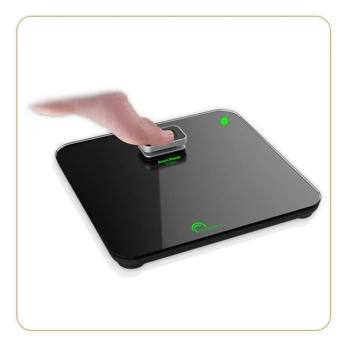 Tecnología Green Power Kinétic: Funcionamiento sin pilas: ¡Sosténgase y pésese! Sencillo, ecológico. Nunca más necesitará baterías - Pantalla integrada en el botón Little Balance Es más espacio - Gran superficie de vidrio templado (300 x 300 mm) para mayor higiene y seguridad - 180 kg / 100 g - 5 años de garantía