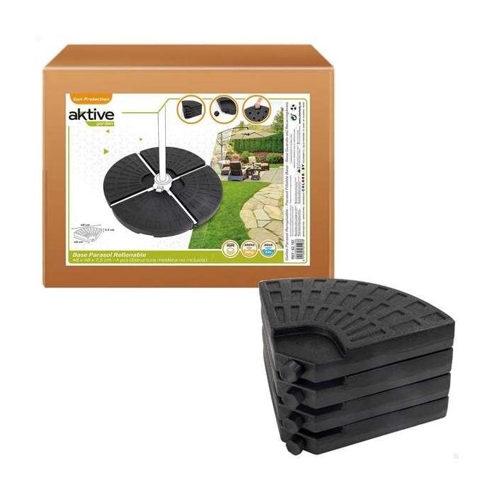 Base redonda para sombrillas Aktive Garden. Puedes rellenar el pie con 52 litros de agua o 66 kilos de arena para mantener en pie tu sombrilla de playa o parasol. Las pieza son color negro y están fabricadas en plástico HDPE. Miden 48x48cm y tiene 7,5 cm de grosor. Ideal para espacios exteriores como el jardín, patio o terraza. ¡Todos tus accesorios y mobiliario de jardín con Aktive Garden!