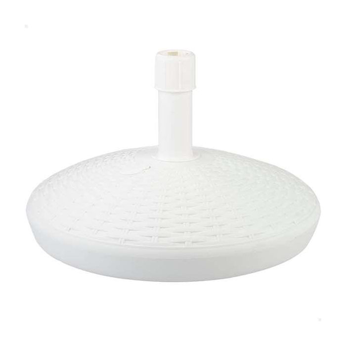 Soporte para sombrilla Aktive Garden forma circular. Tiene un diseño sencillo y elegante color blanco decorado con relieve. Mide Ø58 x 35 cm y es perfecta sombrillas con mástil desde 25 a 48 milímetros de diámetro, ya que el tubo tiene rosca ajustable. Está fabricada de poliresina, un material ligero, resistente al agua y a los rayos del sol. Cuenta con un depósito con tapón que se puede rellenar de agua (30 l) o arena (30 kg). Ideal para asegurar la estabilidad y sujeción de tu sombrilla frente al viento.
