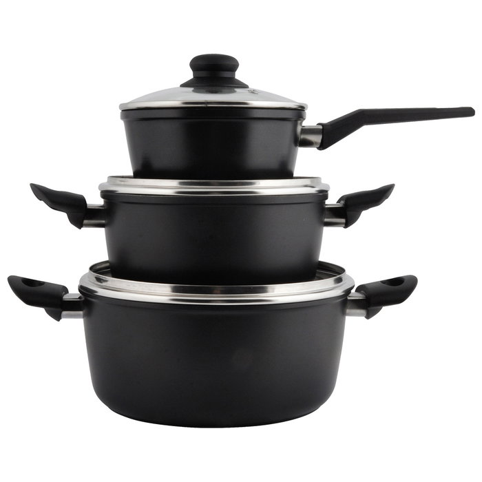 - Incluye: _ Cazo d.16 h.7,5 cm de 1,3 L de capacidad _ Cazuela d.20 h.9,5 cm de 2,5 L de capacidad _ Cazuela d.24 h.10,5 cm de 4,3 L de capacidad Grosor del cuerpo: 2,5 mm