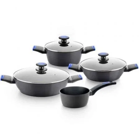 Las piezas están elaboradas en aluminio forjado de 4 mm con antiadherente sin PFOA. Son resistentes y duraderas, aptas para todo tipo de cocinas, incluida la inducción. Son de fondo de gran espesor lo que aporta estabilidad en el cocinado. Cocina con poco aceite gracias a su potente antiadherente bicapa. Las tapas de cristal son de vidrio templado, termorresistentes con aro de acero y válvula de despresurización. Las asas, mango y pomo son ergonómicos para un mejor agarre.