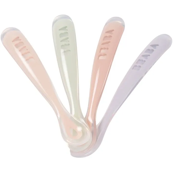 Beaba Set de 4 Cucharas de Silicona para Primera Edad, Azul Viento, Verde Eucalipto, Niebla Ligera, Rosa Antiguo