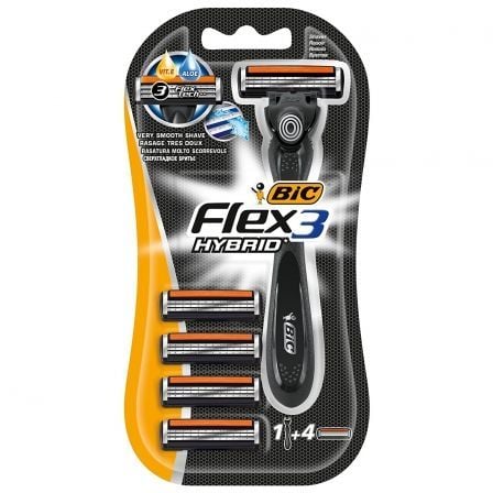 BLÍSTER DE 1 CUCHILLA + 4 RECAMBIOS DE BIC FLEX3 HYBRID - 3 HOJAS MÓVILES CON VITAMINA E Y ÁLOE