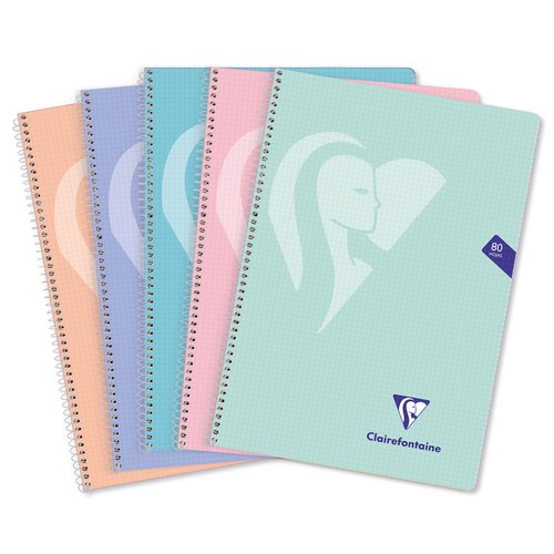 Cuadernos de tapa polipropileno con espiral, cuadrícula 4x4 y margen, en 5 colores surtidos.